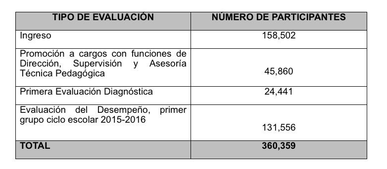 Más de 360 mil docentes participaron en cuatro diferentes evaluaciones docentes que se desarrollaron a lo largo de este año –ingreso, promoción, evaluación diagnóstica y de desempeño–, informó la Secretaría de Educación Pública.