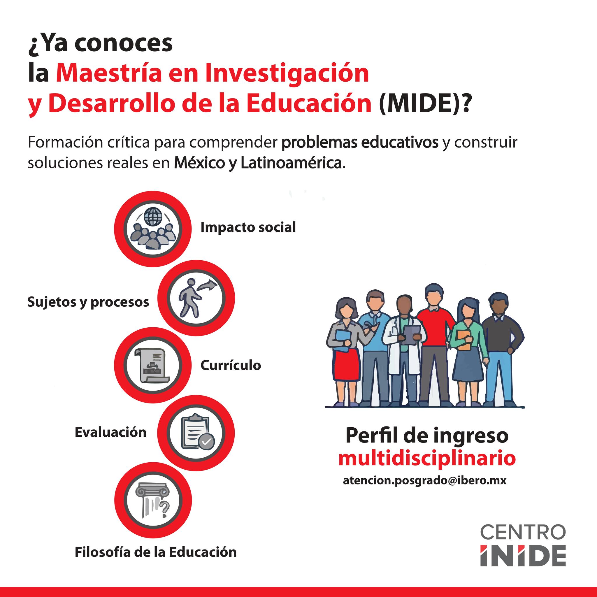 El Centro de Investigaciones Interdisciplinarias para el Desarrollo de la Educación (Centro INIDE) anunció la apertura de la convocatoria 2026 para ingresar a la Maestría en Investigación y Desarrollo de la Educación (MIDE), programa de posgrado de la Universidad Iberoamericana Ciudad de México orientado a la formación de especialistas en el análisis y la atención de problemáticas educativas en México y América Latina, y que forma parte del Sistema Nacional de Posgrados (SNP) de la Secretaría de Ciencia, Humanidades, Tecnología e Innovación