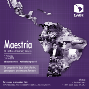 Adicionalmente, Flacso México abre la convocatoria para el concurso “Alicia Martínez” para cursar la Maestría en Políticas Públicas y Género. Las dos becas están dirigidas a personas que trabajan en organizaciones feministas.