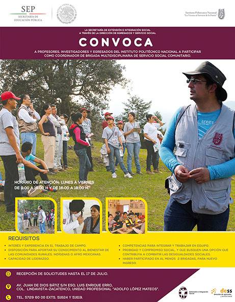 El Instituto Politécnico Nacional (IPN) convoca a los jóvenes estudiantes o pasante de nivel medio superior y superior a unirse a las Brigadas Multidisciplinarias de Servicio Social Comunitario, cuyo registro estará abierto hasta el próximo 17 de julio.