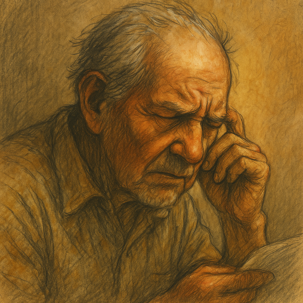 Ilustración de una persona mayor leyendo con dificultad un cartel en español, con luz cálida que ilumina su rostro, representando la lucha contra el analfabetismo en México