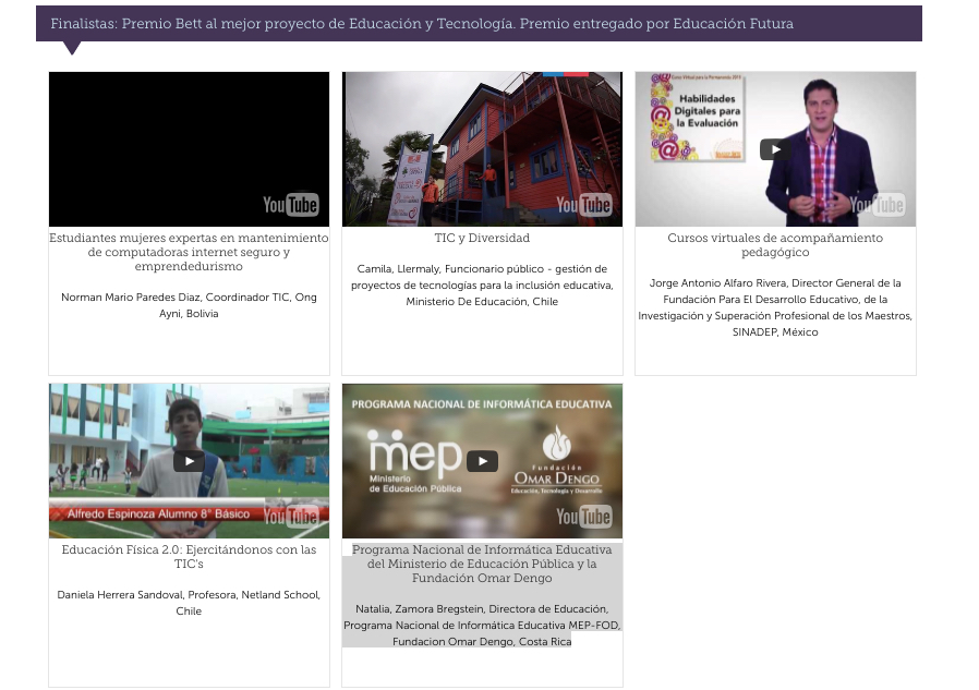 En la categoría de Premio Bett al mejor proyecto de Educación y Tecnología, el cual será entregado por Educación Futura, las y los finalistas son: Estudiantes mujeres expertas en mantenimiento de computadoras internet seguro y emprendedurismo, de Norman Mario Paredes Diaz, Coordinador TIC, de la ONG Ayni Bolivia; TIC y Diversidad, de Camila Llermaly, Funcionario público – gestión de proyectos de tecnologías para la inclusión educativa, del Ministerio De Educación, Chile; Cursos virtuales de acompañamiento pedagógico, de Jorge Antonio Alfaro Rivera, Director General de la Fundación Para El Desarrollo Educativo, de la Investigación y Superación Profesional de los Maestros, SINADEP, México; Educación Física 2.0: Ejercitándonos con las TIC’s, de Daniela Herrera Sandoval, Profesora de la Netland School, de Chile; y Programa Nacional de Informática Educativa del Ministerio de Educación Pública y la Fundación Omar Dengo, de Natalia Zamora Bregstein, Directora de Educación, Programa Nacional de Informática Educativa MEP-FOD, Fundacion Omar Dengo, Costa Rica.