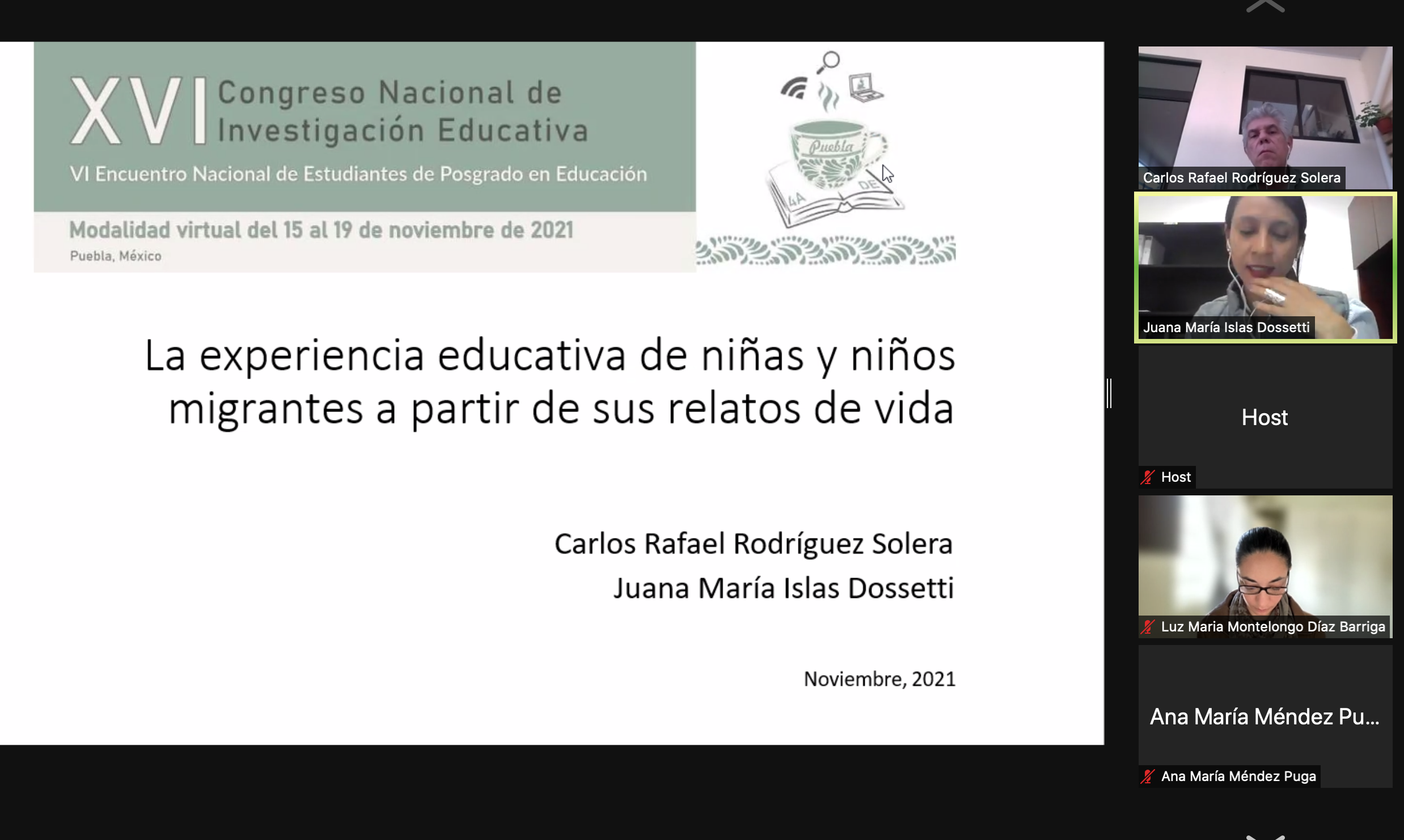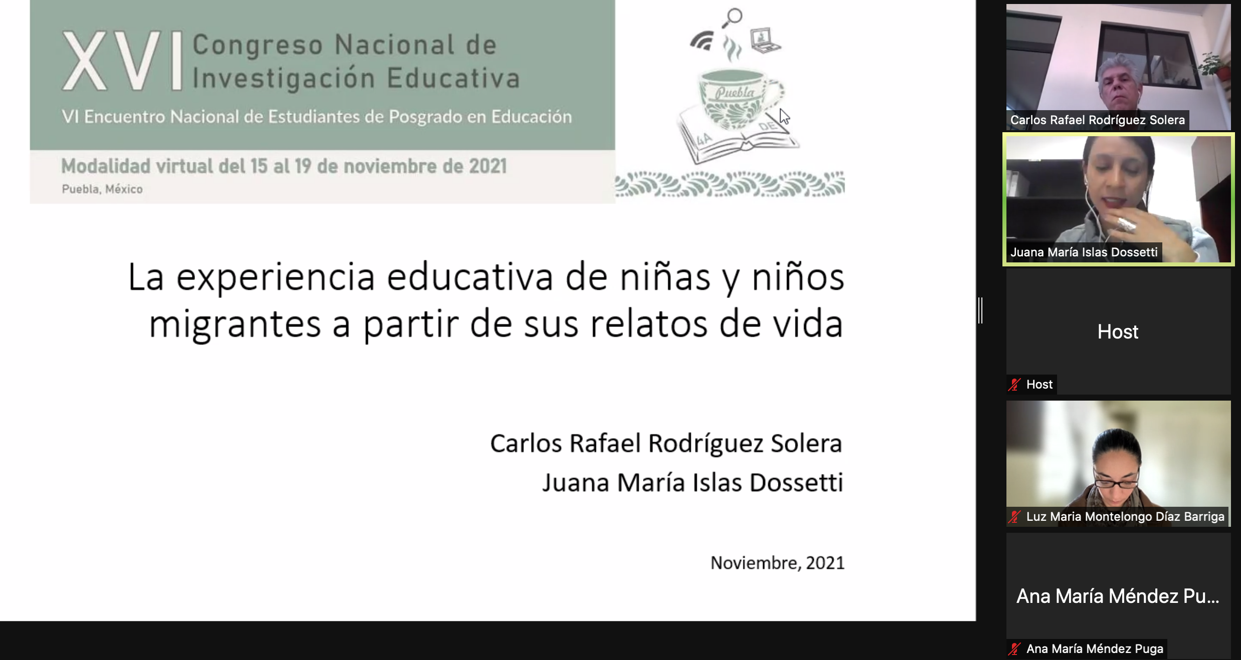 Durante una mesa sobre escuela y experiencia migrante en el XVI Congreso Nacional de Investigación Educativa (CNIE) organizado por el Consejo Mexicano de Investigación Educativa (COMIE); Juana María Islas Dossetti, y Carlos Rafael Rodríguez Solera, presentaron un estudio que caracterizó factores coincidentes en alumnos migrantes que concluyeron su educación básica.