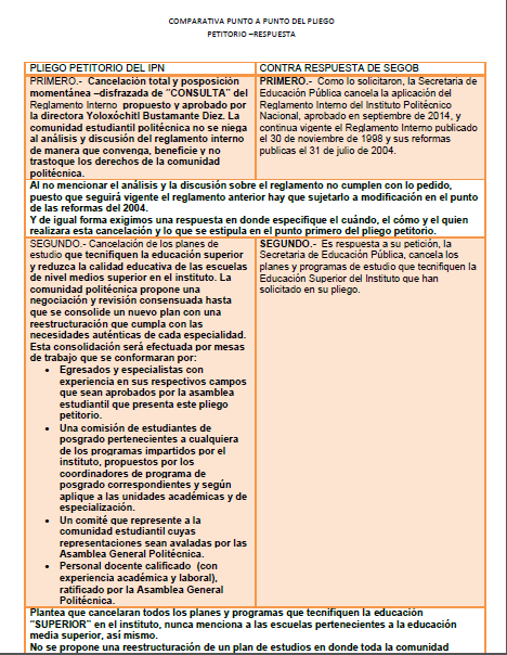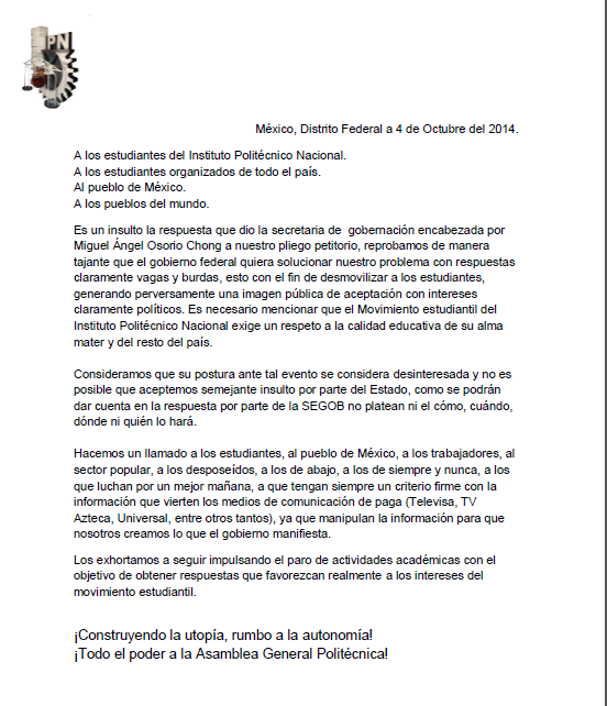 Para los estudiantes de la asamblea general, la respuesta de Gobernación es “desinteresada” por lo que la consideran un “insulto”, por lo anterior han convocado a todas las escuelas del Politécnico a mantener el paro de actividades académicas, “con el objetivo de obtener respuestas que favorezcan realmente a los intereses del movimiento estudiantil”.