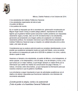 A las 13:00 horas los estudiantes inconformes del IPN se reunirán en asamblea general, para analizar la respuesta que el viernes pasado el secretario de Gobernación, Miguel Ángel Osorio Chong, expresó públicamente a los estudiantes, incluyendo la deposición de la directora del Instituto, Yoloxóchitl Bustamante.