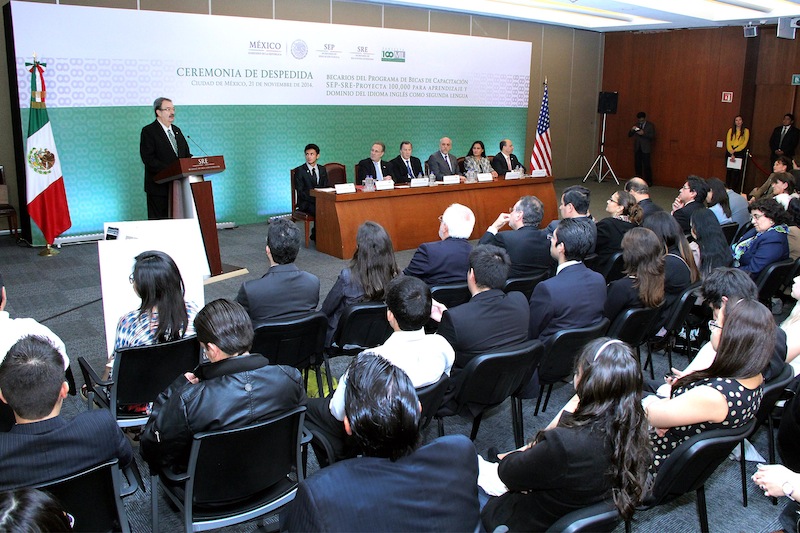 En la ceremonia de despedida de becarios del programa de capacitación SEP-SRE-Proyecta 100 mil el canciller José Antonio Meade Kuribreña reconoció el apoyo de la SEP al programa.