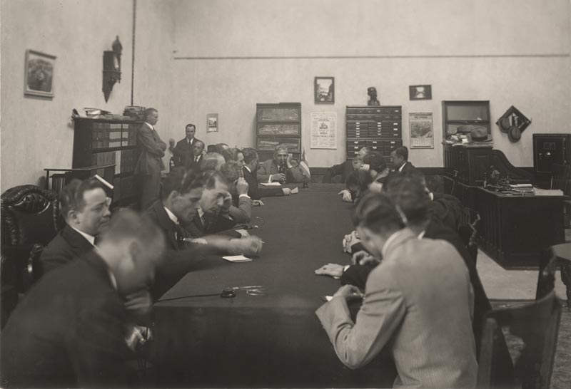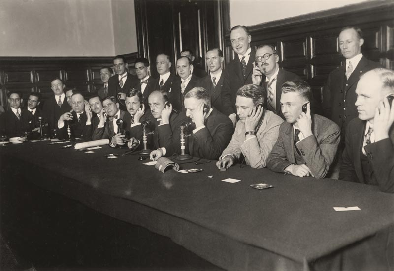 México. Inauguración del servicio telefónico internacional entre México y Canadá en las oficinas generales de la Compañía Telefónica y Telegráfica mejicana. 29.XI.1927. De izquierda a derecha: Mr. E.B. Hawken; Mr. W.H. Hobbs; Mr. P.M. Mc.Cullough, ingeniero jefe de la Compañía Telefónica y Telegráfica Mejicana; Mr. R. Estrada Berg, superintendente general de la misma Compañía; mister J. E. Stevenson, administrador general de la Canadian Bank of Commerce; coronel W. F. Repp, vicepresidente de la Compañía Telefónica y Telegráfica Mejicana; sir H. Thornton, presidente de la Canadian National Railways System; Mr. G. R. Conway presidente de la Mexican Light and Power Cº, y Mr. D. B. Emeno, Bank of Montreal. De pie: Sr. Olivares de la Compañía Telefónica y Telegráfica Mejicana y Mr. J. M. Thompson de la misma Compañía. 1927
