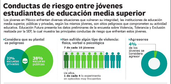 Alrededor de 38 por ciento de estudiantes del nivel medio superior de instituciones públicas y 22 por ciento de escuelas privadas, tienen la percepción de que los planteles educativos son entidades peligrosas y esto genera que el nivel de enseñanza y cobertura de la misma, sea menor.