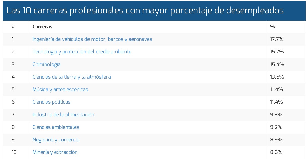 Las 10 carreras profesionales con mayor porcentaje de desempleados son: Ingeniería de vehículos de motor, barcos y aeronaves, con el 17.7%, Tecnología y protección del medio ambiente con 15.7%, y Criminología con 15.4%.