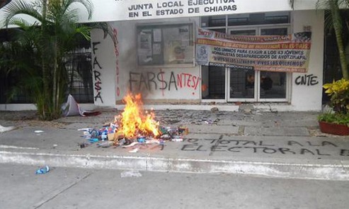 Mientras tanto, la Coordinadora Estatal de Trabajadores de la Educación en Guerrero (CETEG), irrumpió en las oficinas del Distrito Electoral Local 28, ubicado en Tlapa de Comonfort, donde robaron quemaron más de 100 mil boletas electorales, así como mamparas y urnas.