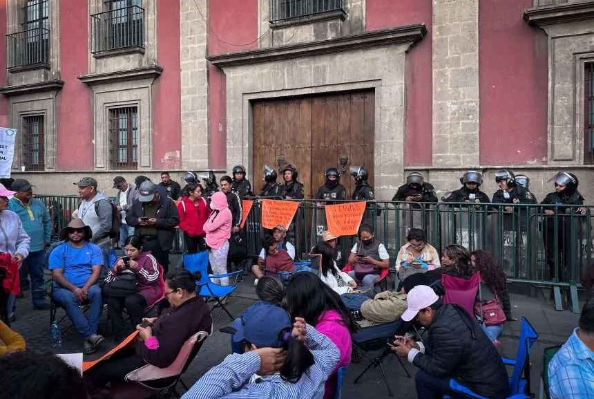 Fotografía de maestras y maestros de la CNTE en plantón frente a Palacio Nacional con pancartas por justicia laboral y social.
