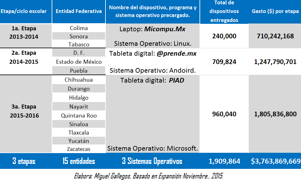 Así en la apertura del ciclo escolar 2013-2014, se puso en marcha en tres entidades del país, el programa MiCompu.mx, sustentado en el documento denominado “dotación de equipos de cómputo portátiles para niños de quinto y sexto grados de escuelas primarias públicas”, el cual entrego 240,000 laptops cargadas con el sistema operativo Linux, con un gasto de 710,242,168 pesos; como nos da a conocer la revista Expansión en su reportaje sobre el PIAD en noviembre de 2015 y que sirve de referencia para argumentar este trabajo.