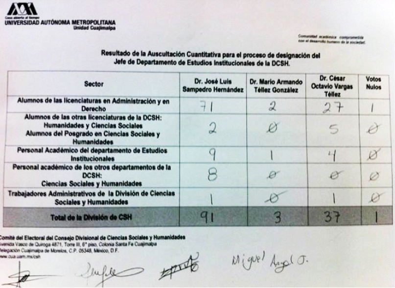 El resumen de los hechos es este: para realizar el cambio de Jefe del Departamento de Estudios Institucionales de la UAM Cuajimalpa, se abre todo un proceso de “auscultación”, con diversas etapas, y en donde se convoca a toda la comunidad a “expresar su sentir”, primero para nombrar una terna de candidatos, y luego para elegir a quien ocupará el cargo por 4 años. A través de votaciones “indicativas”, decenas de cartas, y de todo el intrincado mecanismo de auscultación, quedó claro que la comunidad se sentía inclinada por el Dr. José Luis Sampedro para ser el próximo jefe de departamento. Vean con sus propios ojos, estimados lectores: