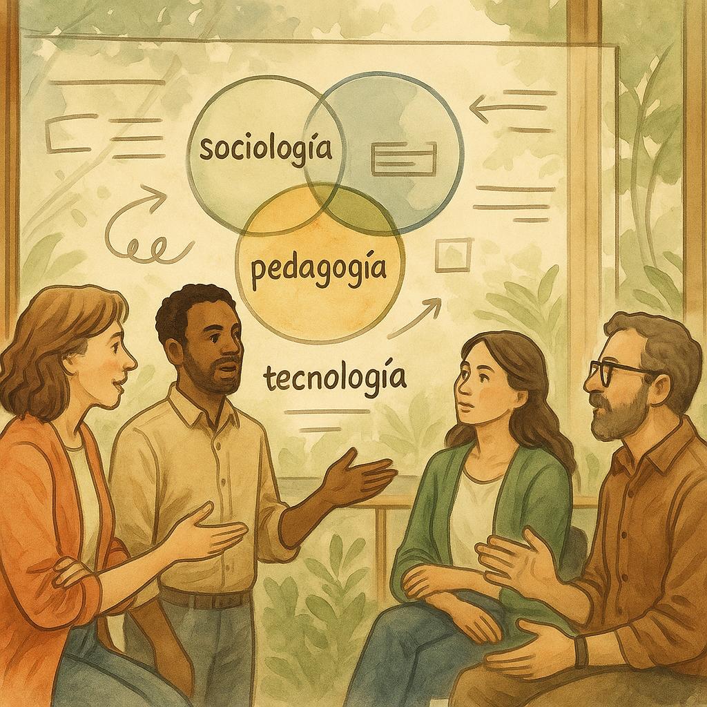 Docentes dialogando en un entorno universitario, frente a un esquema conceptual interdisciplinario.