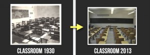 El sistema moderno educativo –el diseño, estructura y proliferación—fue diseñado en la era industrial. La sociedad ha progresado de manera significativa, y aun así nuestro sistema educativo no ha cambiado de manera sustancial. Han habido avances en tecnología, y el sistema educativo ha encontrado formas de adaptar las tecnologías e implementarlas en el ámbito educativo. De cualquier forma, la estructura, diseño y proliferación de la educación sigue estrechamente ligada a la forma en la que se impartía hace 80 años. Esto es ejemplificado con las imágenes del salón de clases que se muestran arriba. Cualquier gran innovador dirá que para ser revolucionario, debes empezar en un lienzo blanco. La reforma educativa que está en la agenda restringe a los maestros; los obliga a buscar nuevas formas de educar pero tienen que estar en sintonía con un sistema educativo anticuado. Los maestros pueden aportar una idea distinta en la forma en la que enseñan a sus alumnos matemáticas y ciencias, pero debe encajar en el sistema tradicional de la escuela, salón de clases y planes de estudio. Esto es un problema.