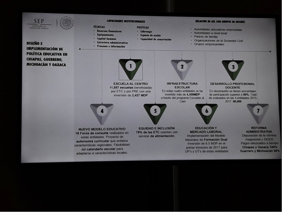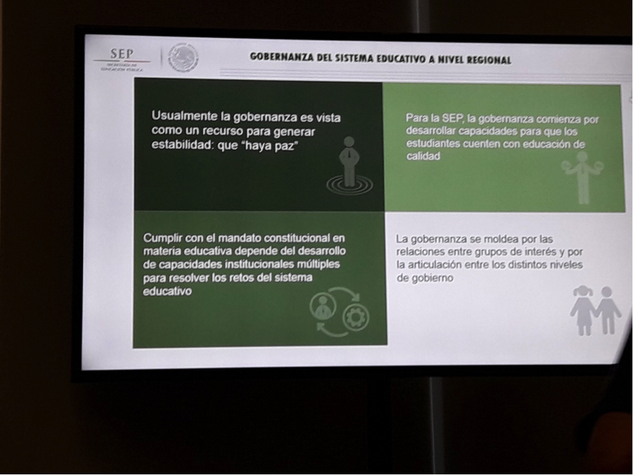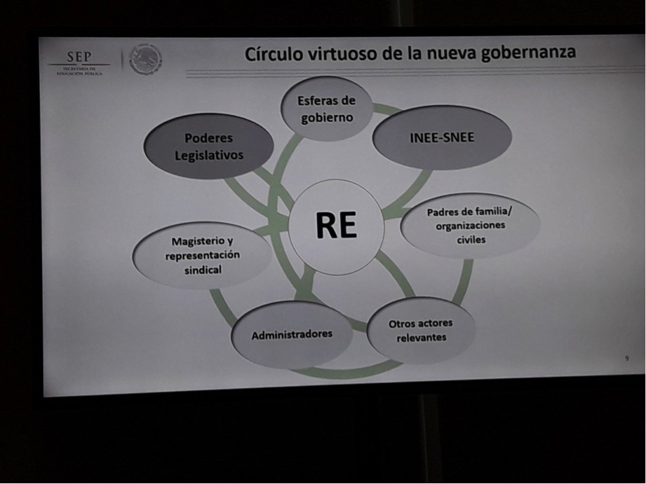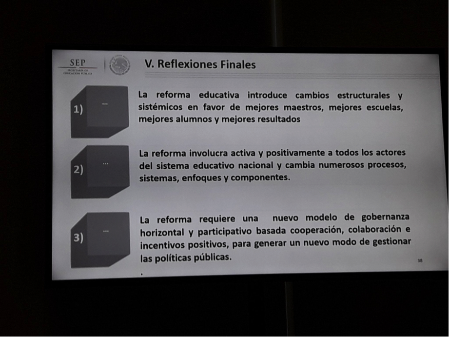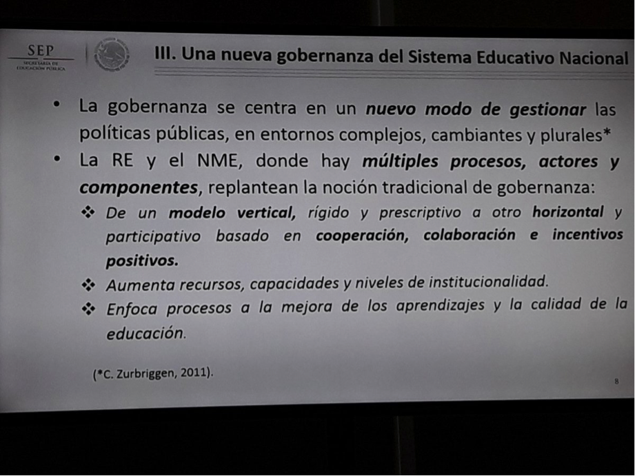 ¿Por qué es necesaria la reforma reformada que llega a la profundidad? Porque el contexto previo estimaba como mayor valor el equilibrio político y corporativo eficiente para diversos agentes; este arreglo político generaba resultados educativos deficientes (cosa que ya dijo en la primera sesión como se puede ver en la primera crónica); era un sistema clientelar y opaco; con deficiente arquitectura administrativa, tecnológica, presupuestal y de gestión; con acuerdos inerciales y escasa visibilidad pública; incluía descentralización heterogénea y distribución de responsabilidades difusa y obsoleta y se basaba en la “colonización” del sistema educativo nacional y estatal.