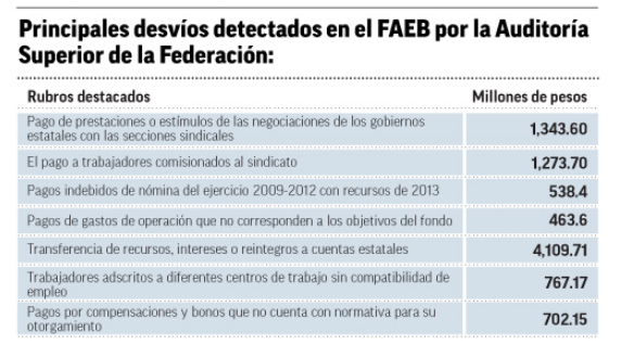En ese reporte detectó desvíos por más de 11 mil millones de pesos por pago de prestaciones, compensaciones, bonos o estímulos estatales locales derivados de las negociaciones de los gobiernos estatales con las secciones sindicales, entre otros pagos indebidos.