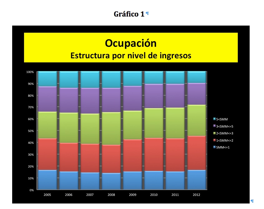 Los asalariados que perciben hasta un salario mínimo mensual (SMM), Gráfico 1, se han mantenido oscilando a lo largo del periodo mostrado, 2005 – 2012. Ocupan una proporción ligeramente por encima del 15 % del total. La segunda menor, después de aquellos que perciben más de 5 SMM.