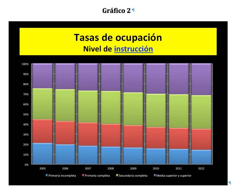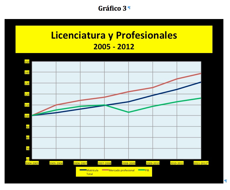 Curiosamente, esto se ha visto reflejado en algo que podríamos llamar sobre-calificación (en términos de nivel educativo, no de calidad ni de crecientes habilidades) de todos los niveles, manifiesto hasta el máximo nivel educativo de la fuerza laboral: en los mercados laborales de profesionales.