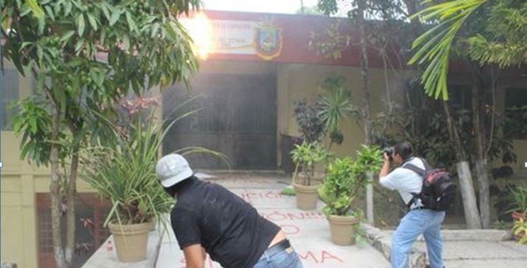 Tras la quema de los documentos y la pinta de las instalaciones, policías antimotines lanzaron gas lacrimógeno para dispersar a los manifestantes.