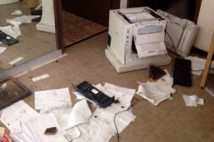 Encapuchados, los normalistas lanzaron bombas molotov contra la entrada principal del edificio, rompieron ventanas y sustrajeron documentos que después fueron quemados en el estacionamiento de la sede.