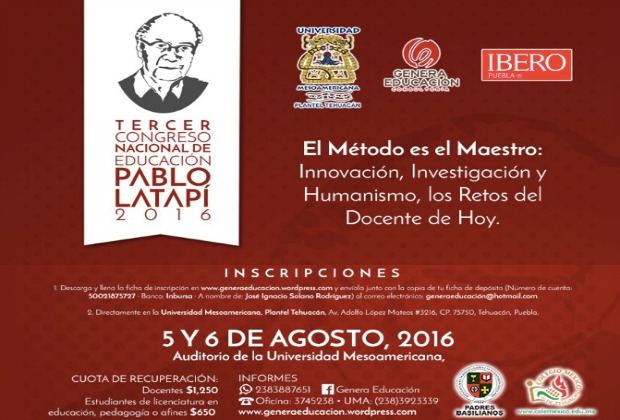El Tercer Congreso Nacional de Educación Pablo Latapí 2016, se celebrará los días 5 y 6 de agosto, en la Universidad Mesoamericana, plantel Tehuacán, en Puebla.