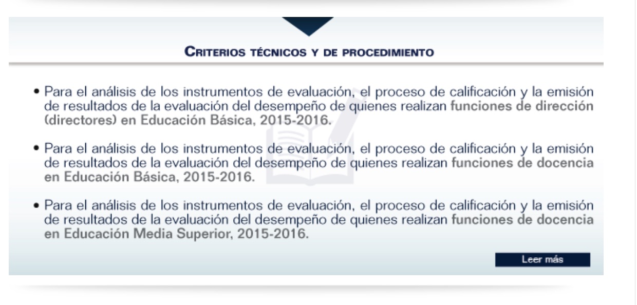 El 5 de noviembre pasado la Junta de Gobierno del Instituto Nacional para la Evaluación de la Educación (INEE) aprobó y dio a conocer, a través de su página web, los criterios técnicos y de procedimiento para el análisis de los instrumentos de evaluación, así como sobre el proceso de evaluación y la emisión de resultados de la evaluación del desempeño de directores y maestros de educación básica, así como de profesores de media superior. La publicación de los tres documentos se replicó en el Diario Oficial de la Federación (DOF) del viernes 13 de noviembre.