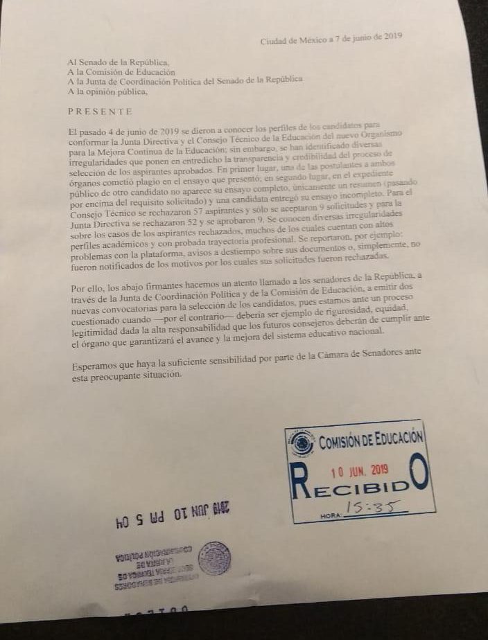 Mediante la plataforma de change.org se juntaron 1,008 firmas, las cuales fueron entregadas a la Comisión de Educación y a la Junta de Coordinación Política de la Cámara de Senadores solicitando que vuelvan a realizar el proceso de selección de candidatos a la Junta Directiva y al Consejo Técnico de Educación del organismo para la mejora continua de la educación que sustituirá al Instituto Nacional para la Evaluación de la Educación (INEE).