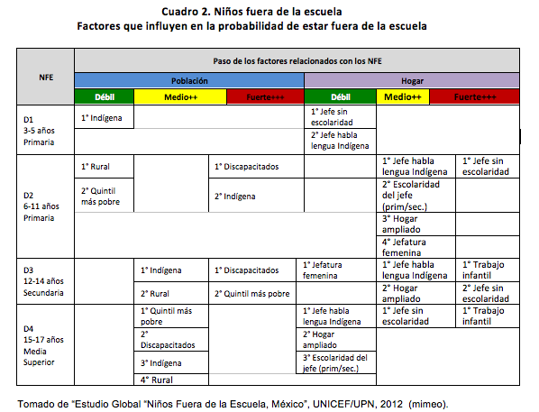 En relación a la segunda pregunta relativa a los rasgos de los niños fuera de la escuela es evidente la relación entre exclusión e inequidad. Los niños de las familias que se ubican en los estratos más pobres tienen la mayor probabilidad de abandonar las aulas. Adicionalmente, condiciones como la discapacidad, la migración, el trabajo infantil y la etnia constituyen barreras al acceso aún cuando la cobertura sea suficiente.