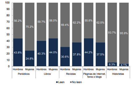 De acuerdo a la gráfica 2, los hombres leen en mayor medida periódicos, páginas de internet, foros y blogs e historietas. En tanto, que las mujeres son más afectas a leer libros y revistas. Y de la población lectora de revistas, la temática de preferencia fue “el entretenimiento” 31.1%, siguen los temas de “bienestar o salud” y “cultura general o temas de interés” con 23.9%; las revistas “especializadas, técnica o científica”, representa 22.5%” (INEGI, 2019, p.9).
