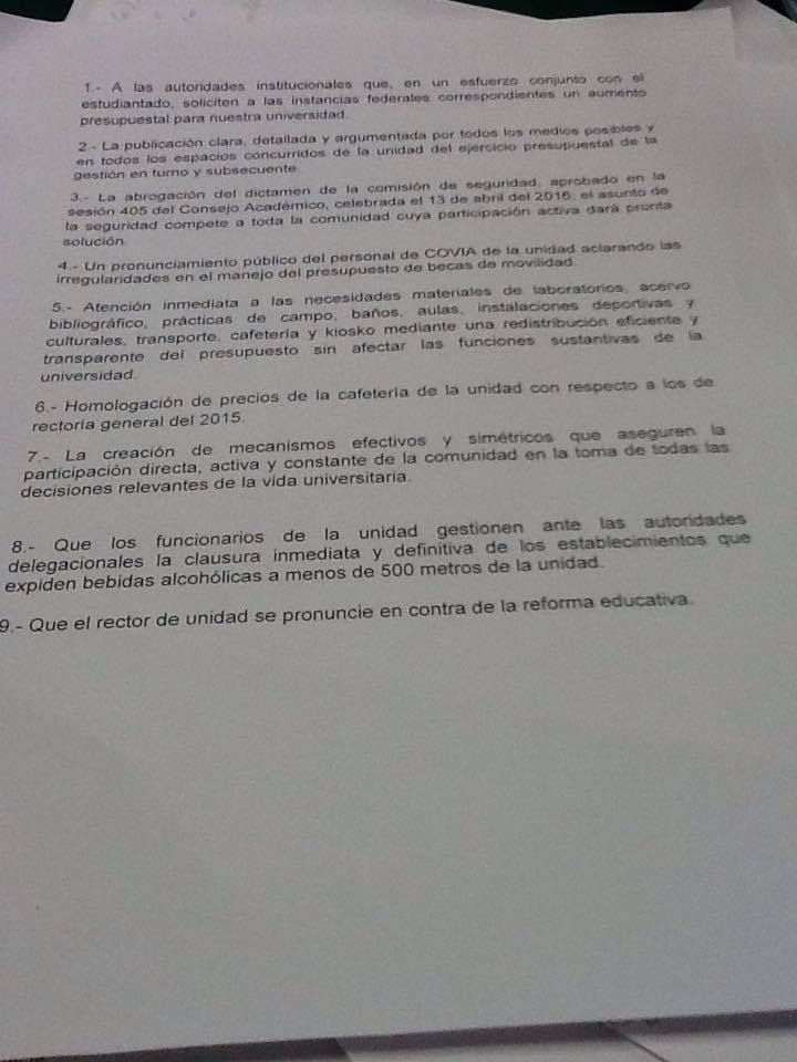 Exigimos que no se coloquen torniquetes privilegiando la capacitación y que se duplique la plantilla del personal de vigilancia, dando los insumos necesarios acordes a las necesidades de la Unidad.Exigimos que no existan represalias, ni seguimiento contra los estudiantes que estén participando en la lucha del pliego petitorio y simpatizantes. Exigimos que el rector de unidad haga la gestión necesaria con la delegación o autoridad competente, para cerrar los establecimientos que expidan bebidas alcohólicas a menos de 500 metros de la zona escolar. Exigimos que el monitoreo de las cámaras de vigilancia este a cargo de trabajadores de base, y que los estudiantes tengamos acceso a las grabaciones. Exigimos que se den las facilidades para hacer cambios de grupo en caso de existir problemas de acoso o intimidación a los estudiantes, por parte de los profesores.