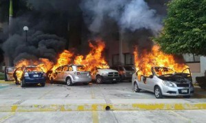 En tanto, otros contingentes rociaron gasolina y prendieron fuego a seis automóviles. En la fachada del inmueble pintaron cuatro leyendas, en el monumento a los héroes del país:Mueran los partidos políticos; Nido de ratas; APG (Asamblea Popular Guerrerense) y Ceteg