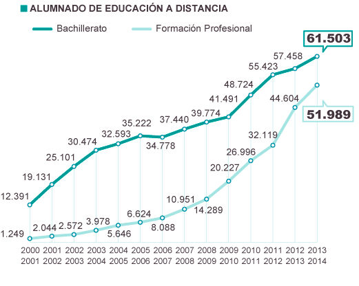 La segunda oportunidad llega en muchos casos a distancia. A María de los Ángeles Olmedo le llegó por esa vía a los 24 años, cuando decidió retomar los estudios que dejó a los 14. A distancia ha conseguido el título de la ESO y el de bachillerato de ciencias. Si la crisis ha empujado a miles de jóvenes a seguir estudiando o a retomar los libros después de abandonados (este curso habrá 282.000 alumnos más de FP y bachillerato que en 2008-2009), la opción a distancia se está convirtiendo en una de las principales vías de reenganche. En el bachillerato, esta vía ha crecido un 54% desde que arrancó la crisis (hasta alcanzar los 61.503) y en la FP se ha multiplicado por 3,6 hasta 51.989. Más de 93% de la oferta a distancia es pública.