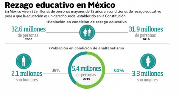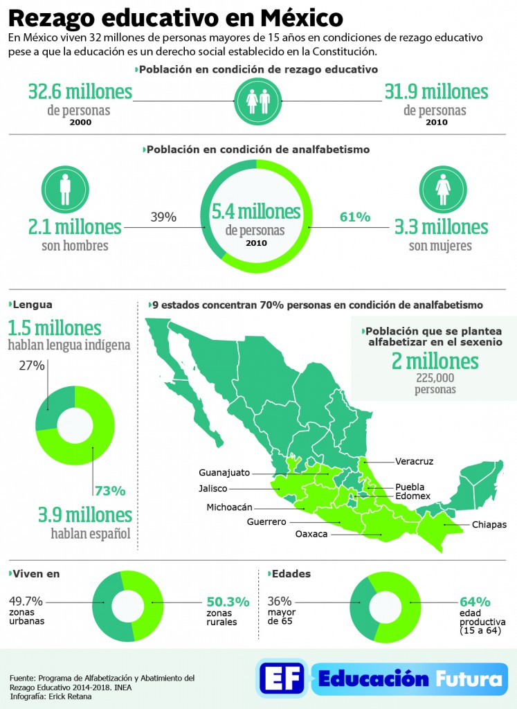 EL Instituto Nacional para la Educación de los adultos, INEA, estima que el número de mexicanos que no ha concluido su educación básica es de aproximadamente 32 millones, compuesto de 5.4 que no saben leer ni escribir; 10 que no ha terminado su instrucción primaria y más de 16 que no han concluido el nivel de secundaria.