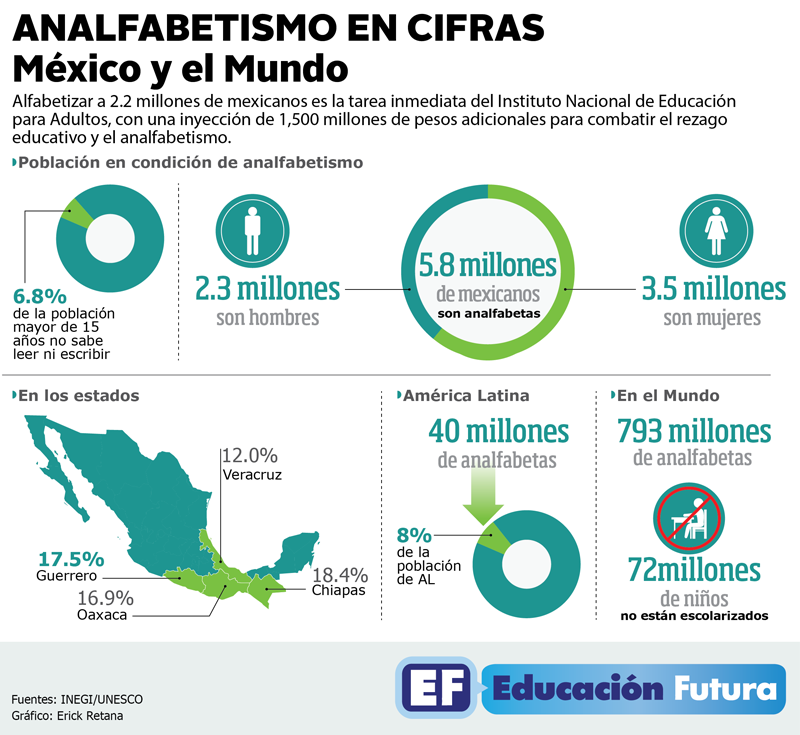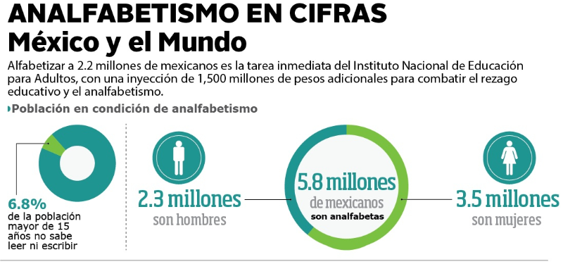 El índice de analfabetismo en México ha permanecido intacto en diez años; cerca de 6.8 por ciento de la población mayor de 15 años. Ahora la cifra alcanza unos seis millones de mexicanos que no saben leer ni escribir. El índice permanece, la cifra aumenta.