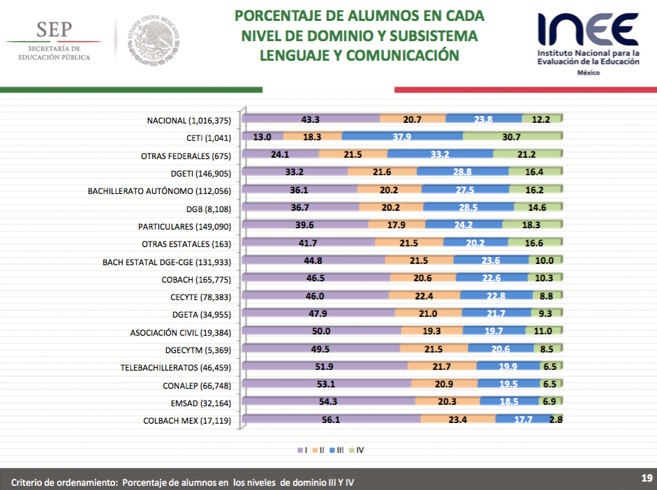 Hablando de subsistemas, el Centro de Enseñanza Técnico Industrial (CETI) tuvo los mejores resultados con 30.7% de alumnos en nivel IV, aunque hay que mencionar que la muestra fue de un poco mas de mil alumnos; lo mismo ocurrió con las instituciones catalogadas como “otras federales”, donde el porcentaje fue de 21.2%, de un total de 675 alumnos, en el caso de las escuelas particulares, la muestra incluyo a 149 mil 90 alumnos, el 18.3% estuvo en el nivel más alto.