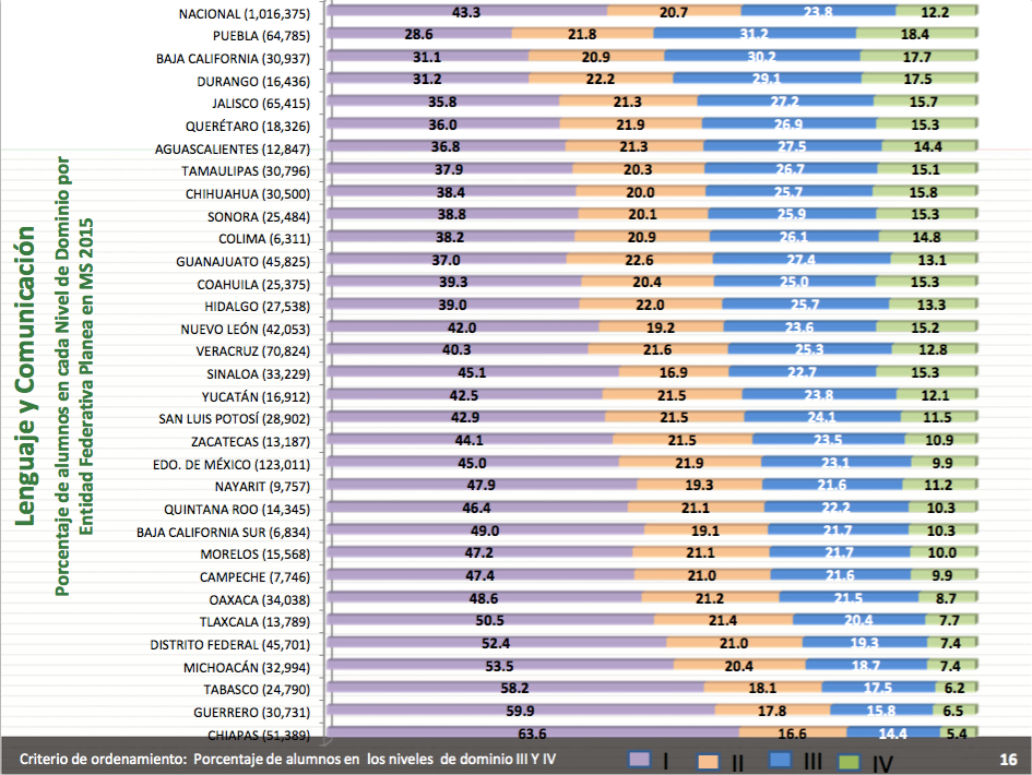 Los estados de Chiapas, Guerrero y Tabasco tuvieron los porcentajes más altos de alumnos en ese nivel. En Chiapas fueron evaluados 51 mil 389 alumnos, el 63.6% se colocó en el nivel I; en Guerrero, de 30 mil 71 examinados, 59.9% tuvieron dicho nivel; mientras que en Tabasco la cifra correspondió al 58.2% de 24 mil 790.