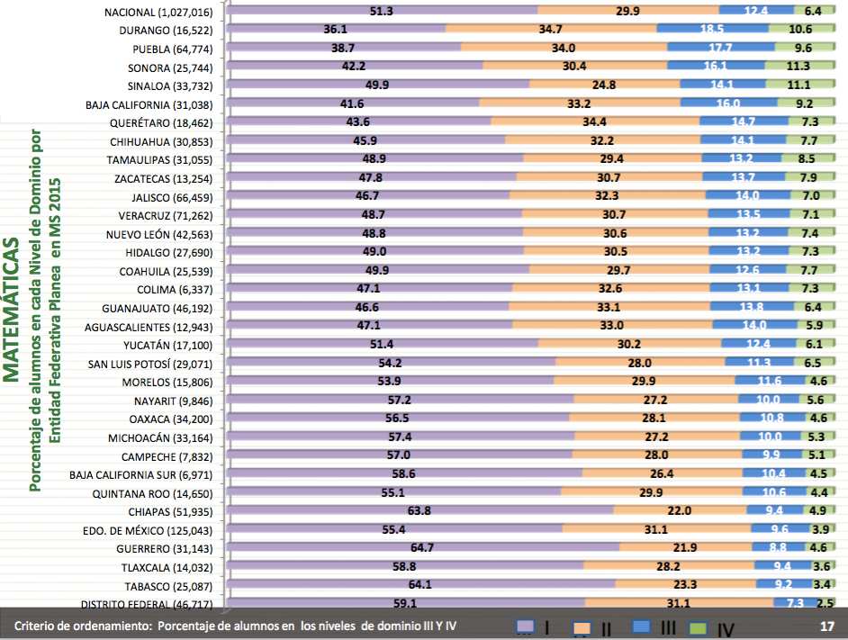 Los resultados, a nivel nacional, no fueron los mejores, “en la Media Superior hay un problema de aprendizajes insuficientes. Y si la pudiera calificar gráficamente, es como una suerte de pirámide, en donde en la base hay una alta concentración de jóvenes en los bajos niveles de logro y en la cúspide están aquellos, los concentrados o los que se refieren al nivel 4, en donde son una proporción relativamente reducida”, explicó Rodolfo Tuirán , Subsecretario de Educación Media Superior.