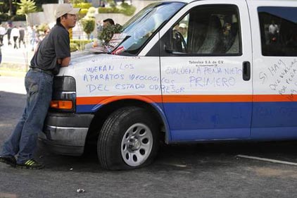Miles de maestros de la Coordinadora Nacional de Trabajadores de la Educación (CNTE) bloquearon el Periférico, a la altura de Tv Azteca, y avenida Chapultepec, frente a Televisa, para exigirles tiempo de transmisión y ejercer su derecho de réplica debido a que ambos consorcios han generado ‘‘una brutal campaña de linchamiento’’ contra su movimiento que se opone a la reforma educativa.