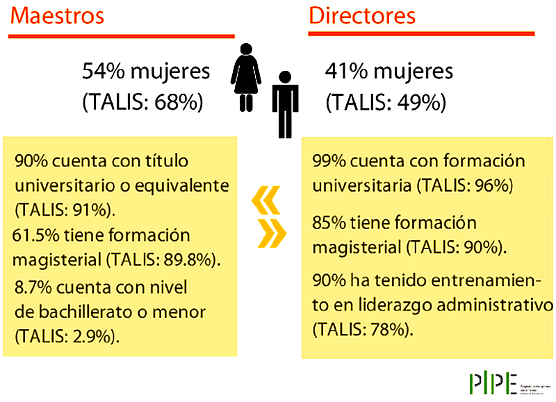 En lo que respecta a la formación y prácticas de desarrollo profesional de los docentes, TALIS 2013 nos indica que la mayoría de los profesores de secundaria mexicanos trabajan en escuelas donde el Director no los considera calificados, casi 40% no cuenta con una formación magisterial inicial (TALIS: 10.2%) y 90% tiene una escolaridad de licenciatura o similar (TALIS: 91%).