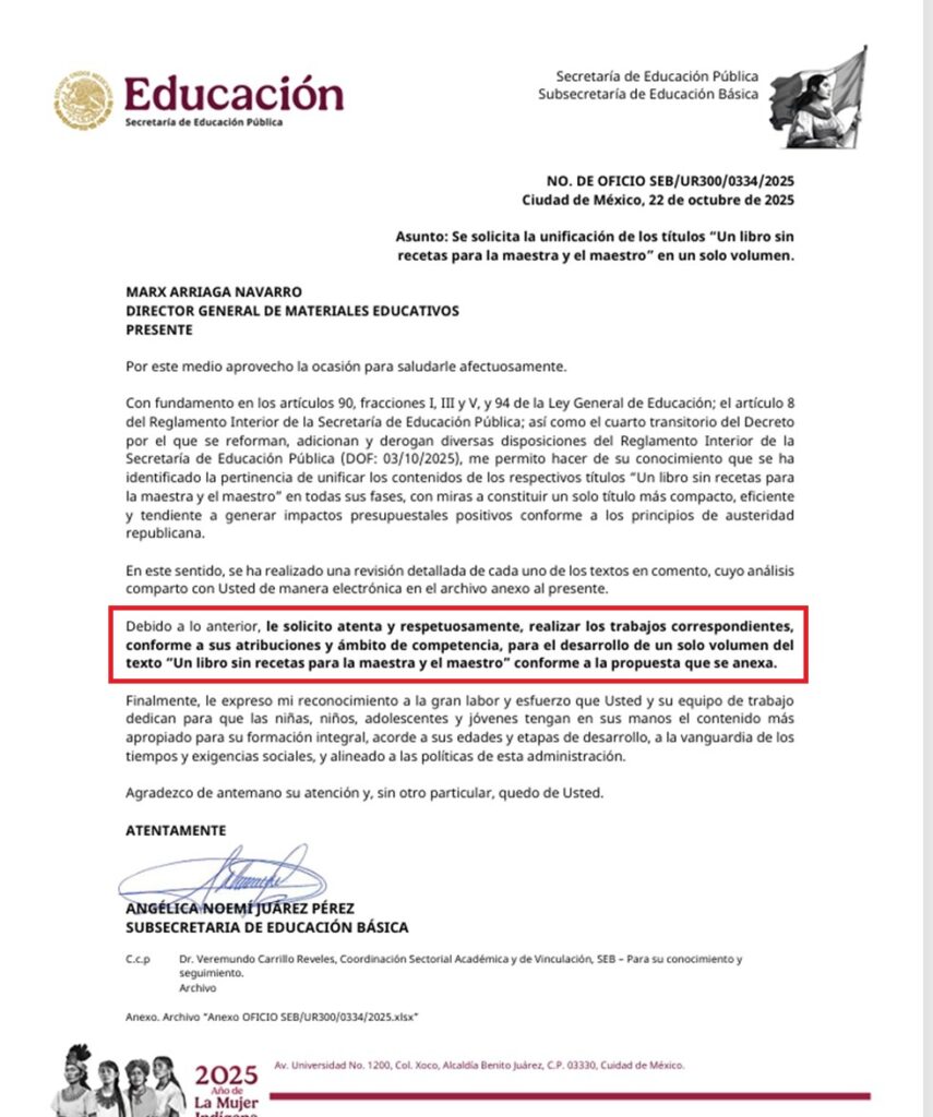 El 22 de octubre la subsecretaria envió a Arriaga un oficio en el que lo instruye para que compacte y haga un solo volumen (de 106 páginas) de los cinco materiales de Un libro sin recetas para la maestra y el maestro.