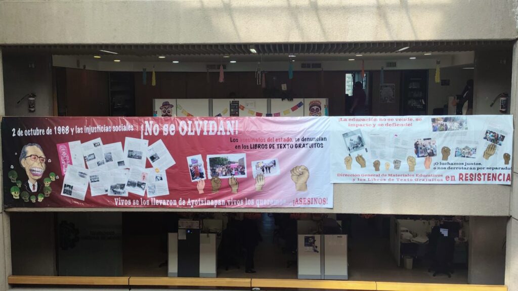 En el interior del edificio del Centro SEP de avenida Universidad, Ciudad de México, cuelga una lona en la que se expresa (sin haber consultado a los trabajadores) que la DGME está en “resistencia” por la defensa de los libros.