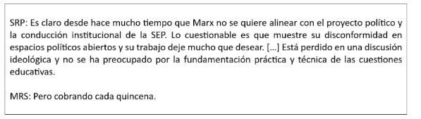 A Xóchitl Moreno Fernández, directora general de Desarrollo Curricular, la tildó de calderonista y funcionaria del PRIAN, y a su dirección la calificó de “cloaca” (lugar inmundo) debido a que hizo una edición del Plan de Estudio 2022 sin las fotos de los maestros participantes en las asambleas organizadas por él. Entonces escribió: se intentó, “una vez más, descafeinar la Nueva Escuela Mexicana… Esto parece más el trabajo de las cloacas en la SEP”.