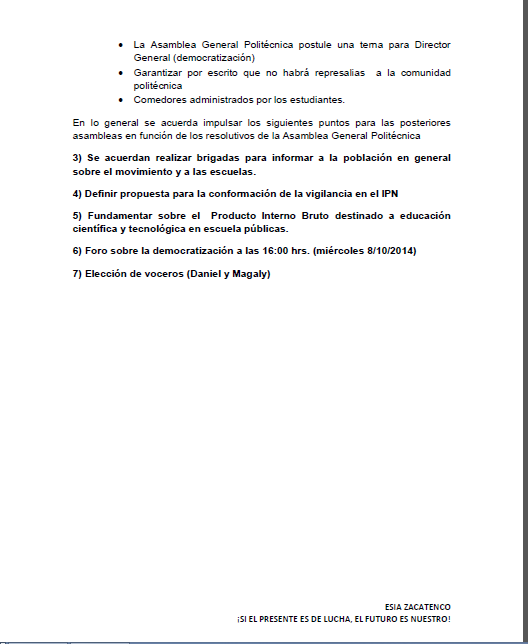 Además, han planteado “aclarar los tiempos del cese de pensiones de los ex directores generales para evitar amparos”. La ESIA, a través de su asamblea, acordó pedir que el Centro de Lenguas Extranjeras (Cenlex) del IPN, sea gratuito para los estudiantes de la ESIA, que se destituya al académico Pino Durán Escamilla junto con su gabinete.