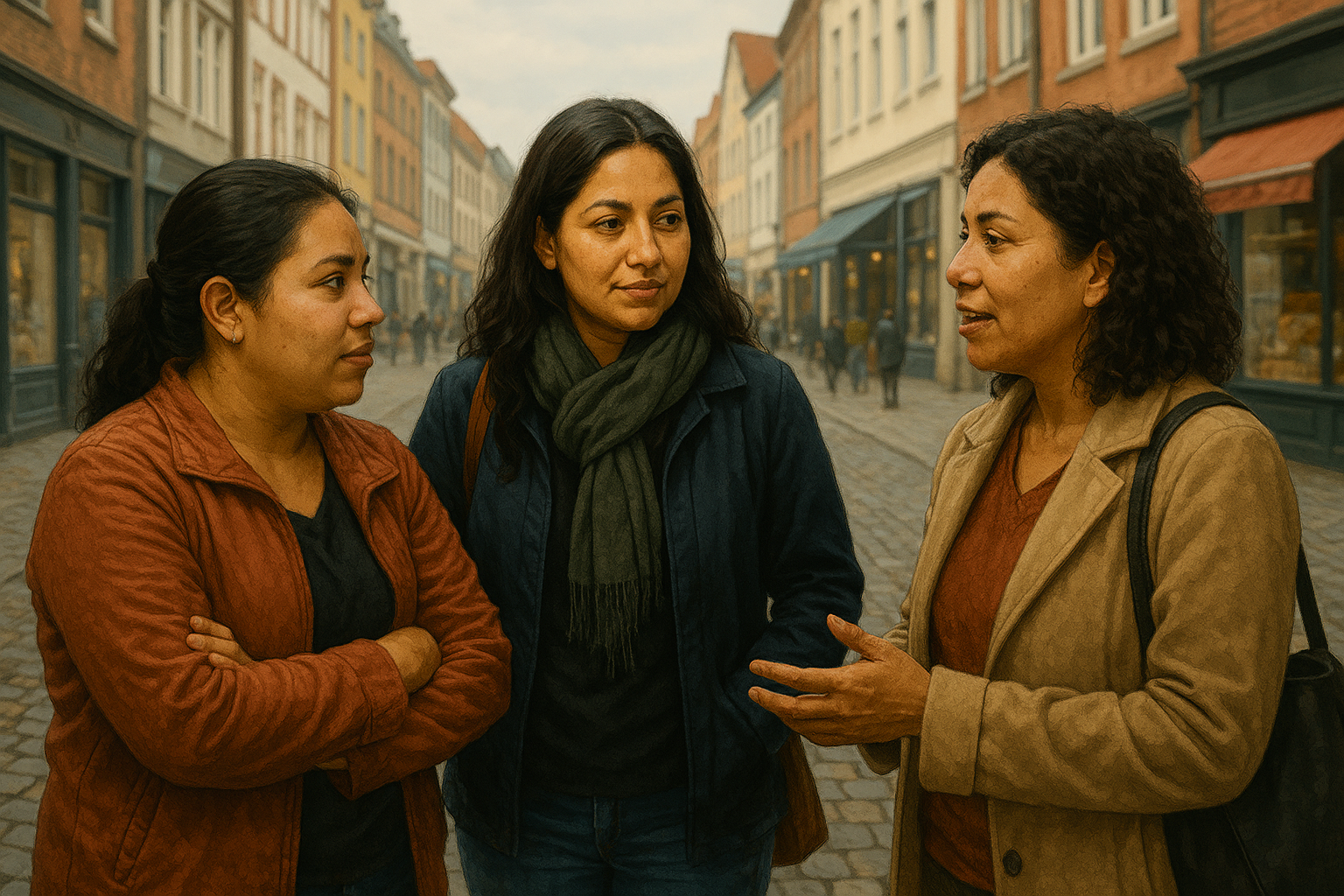 Ilustración de tres mujeres latinoamericanas charlando en una calle urbana de Alemania con edificios de fondo.