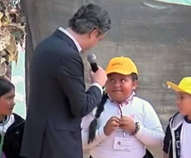 Se dice “leer”, no “ler”; insiste la niña ante Aurelio Nuño, quien, entre risas alcanza a reafirmar “le-er, le-er. Muy bien Andrea”.