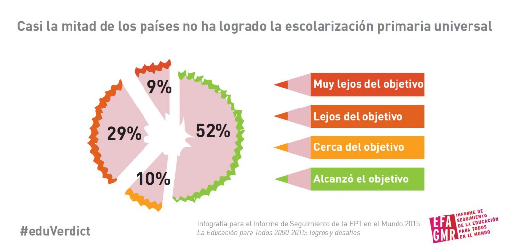Los niños pobres tienen cinco veces más probabilidades que los ricos de abandonar los estudios primarios y sólo uno de cada tres países del mundo han alcanzado la totalidad de los objetivos planteados por esta organización en el año 2000, según el informe de seguimiento Educación para Todos en el periodo (EPT) 2000-2015, preparado por la Organización de las Naciones Unidas para la Educación, la Ciencia y la Cultura (UNESCO).