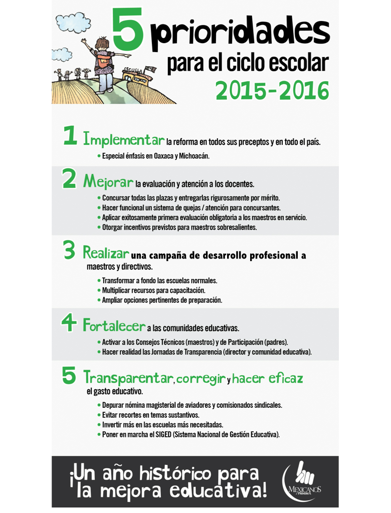 En conferencia de prensa, Mexicanos Primero estableció, las que a su juicio, deben ser las prioridades para el ciclo escolar 2015-2016. La primera es implementar la reforma en todos sus preceptos y en todo el país.