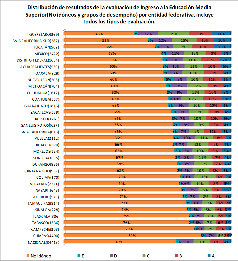 Por entidades, los mejores resultados para el concurso de plazas docentes se presentaron en Querétaro, Baja California Sur y Yucatán; mientras los peores se registraron en Chiapas, Campeche y Tabasco.