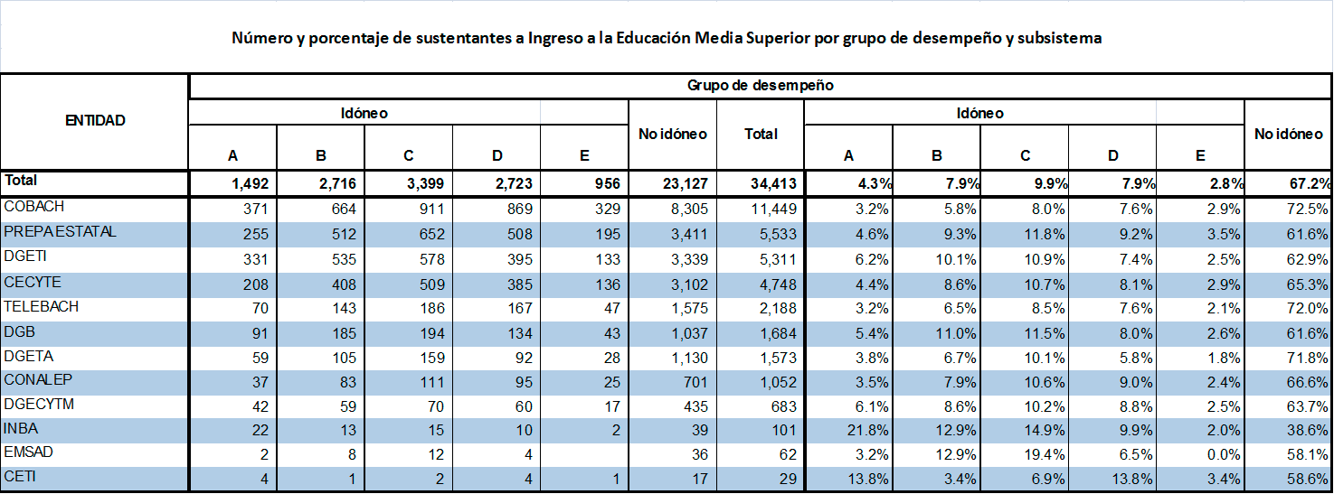 En números duros, 23 mil 127 sustentantes obtuvieron la calificación “idónea”, que les permite acceder a una de las 8 mil 903 plazas que se ofrecen en el sistema de bachillerato nacional, en los colegios de bachilleres, las preparatorias estatales, Conalep, Cetis, Cebetas y telebachilleratos, entre otros.